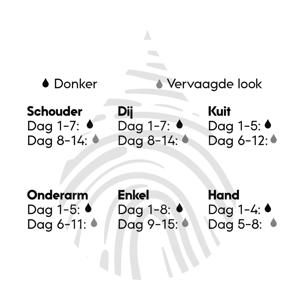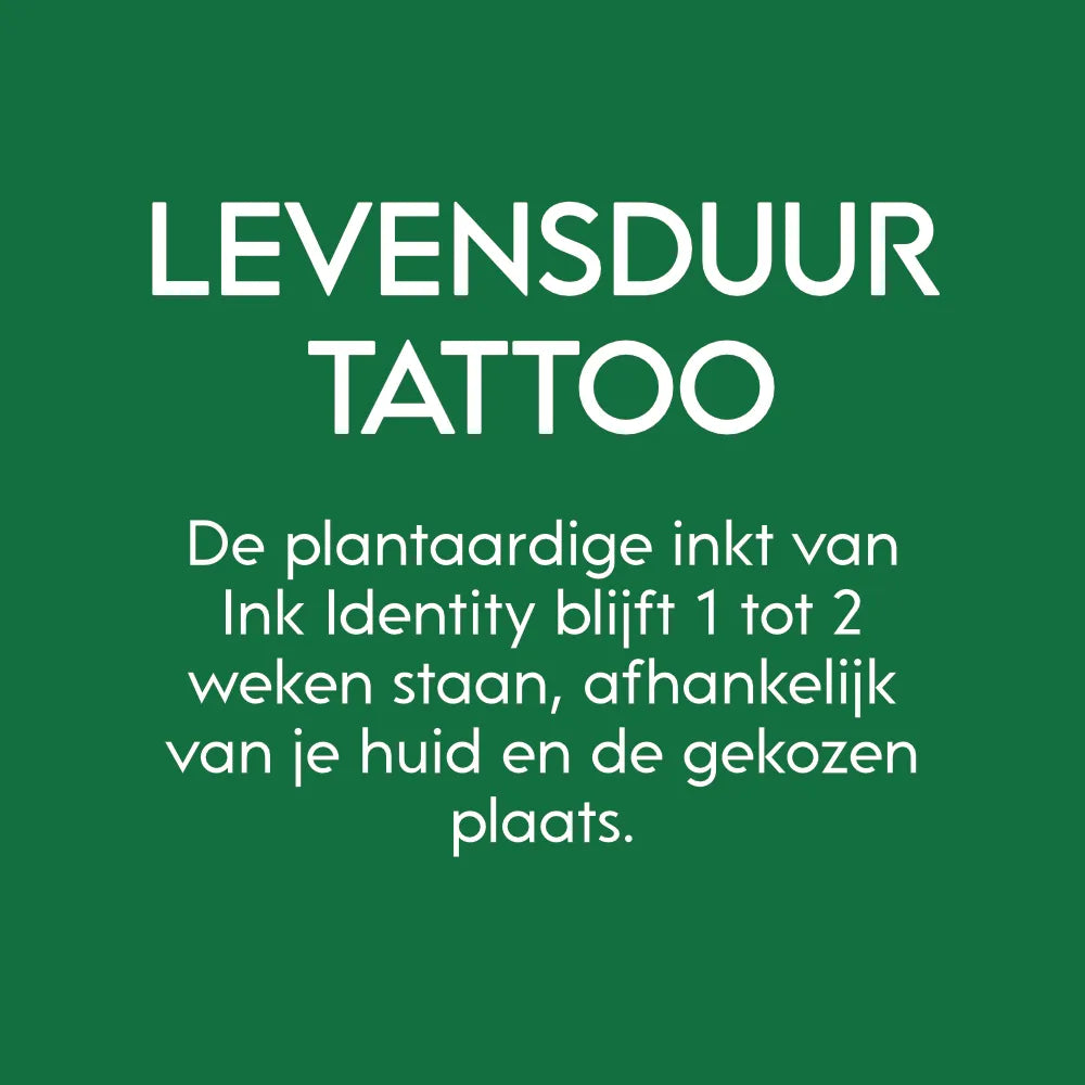 De natuurlijke inkt van de Ink Identity tattoo blijft 1-2 weken staan, afhankelijk van je huid en de plaats. Scrub je tattoo niet hard tijdens het wassen, dip de tattoo droog, hydrateer je huid met hydraterende crème.